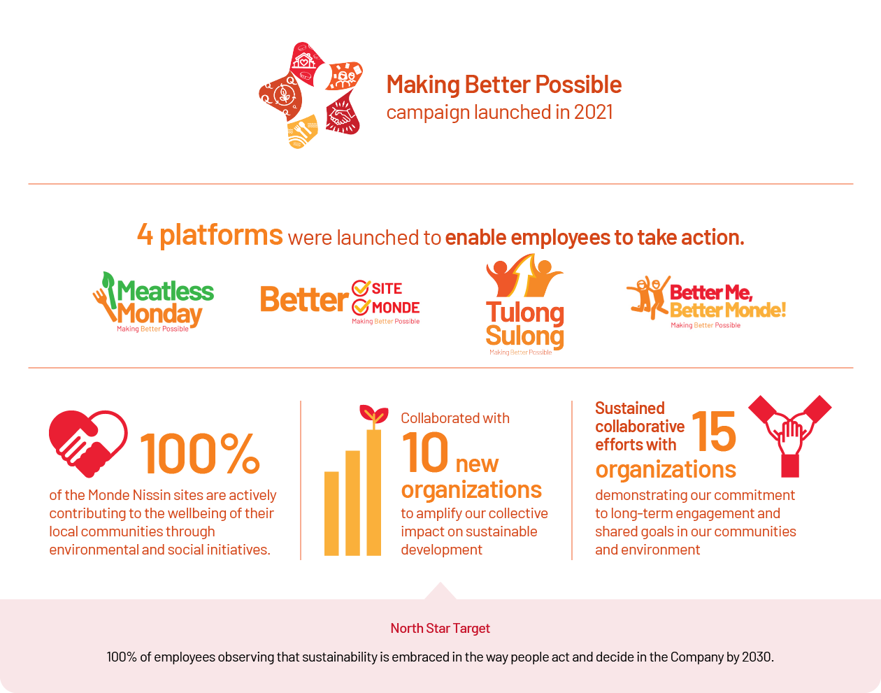 Making Better Possible encapsulates the desire of Monde Nissin Corporation to continue to improve as a company, uplifting those around it in the process. It also serves as our rallying call.
